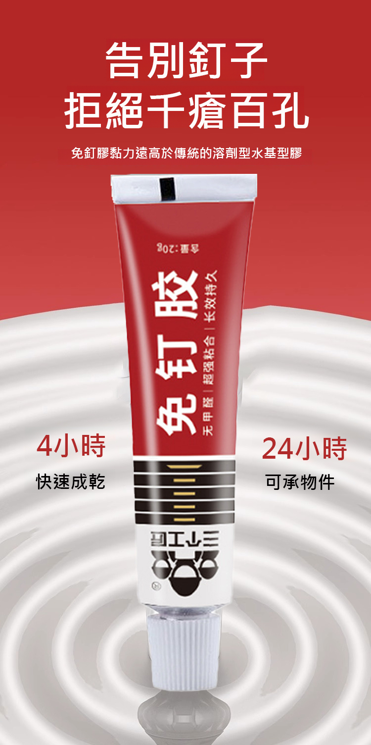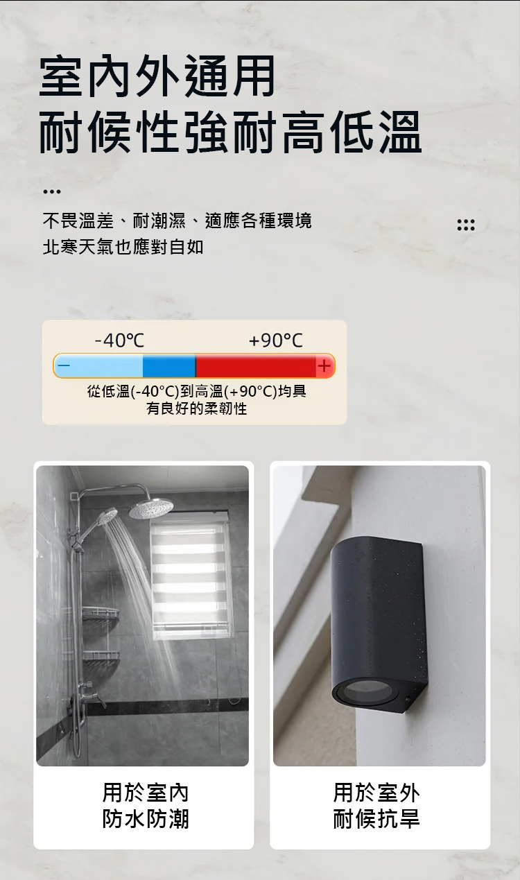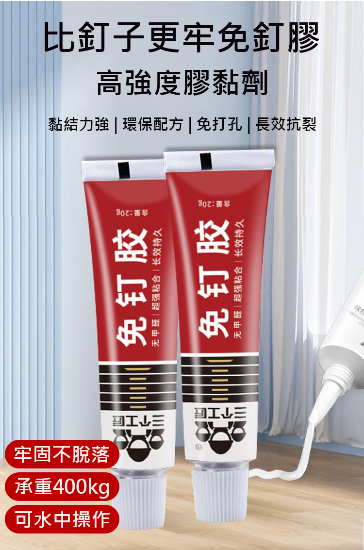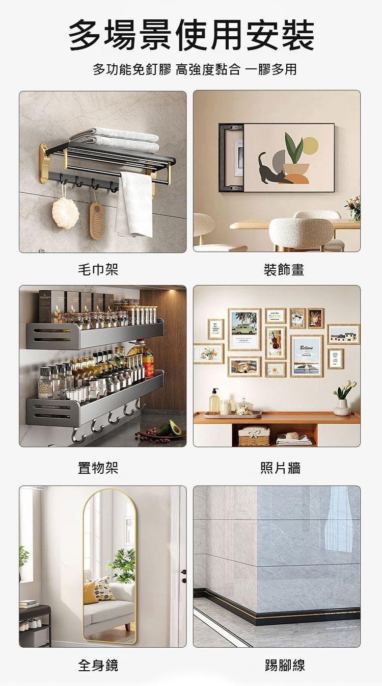採用進口 MS 新型材質,5 秒快速定位,初黏力超強,4 小時快速成乾,24 小時就能承重,400kg 的拉力相當於掛 8 個成年人,掛置物架、全身鏡、裝飾畫都穩如磐石。耐高低溫性能拉滿,-40℃低溫至 90℃高溫都不變形、不開裂,室內外通用,浴室防水防潮、室外耐候抗旱