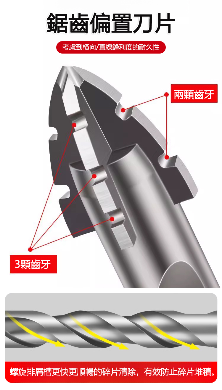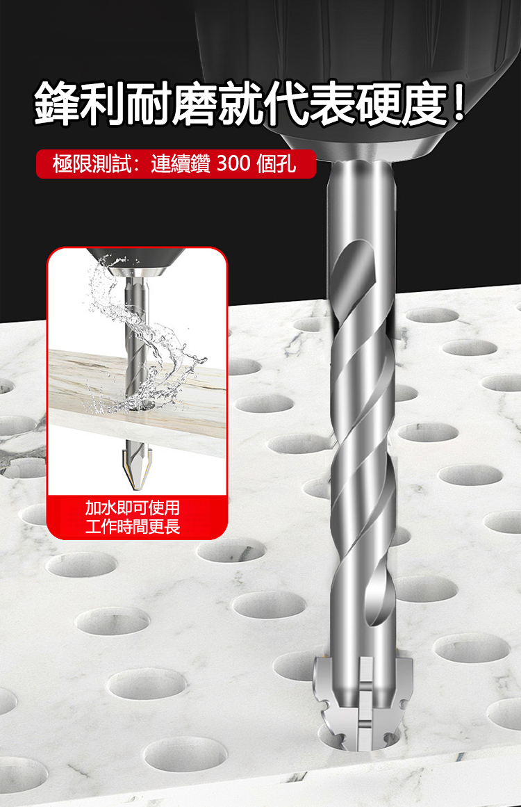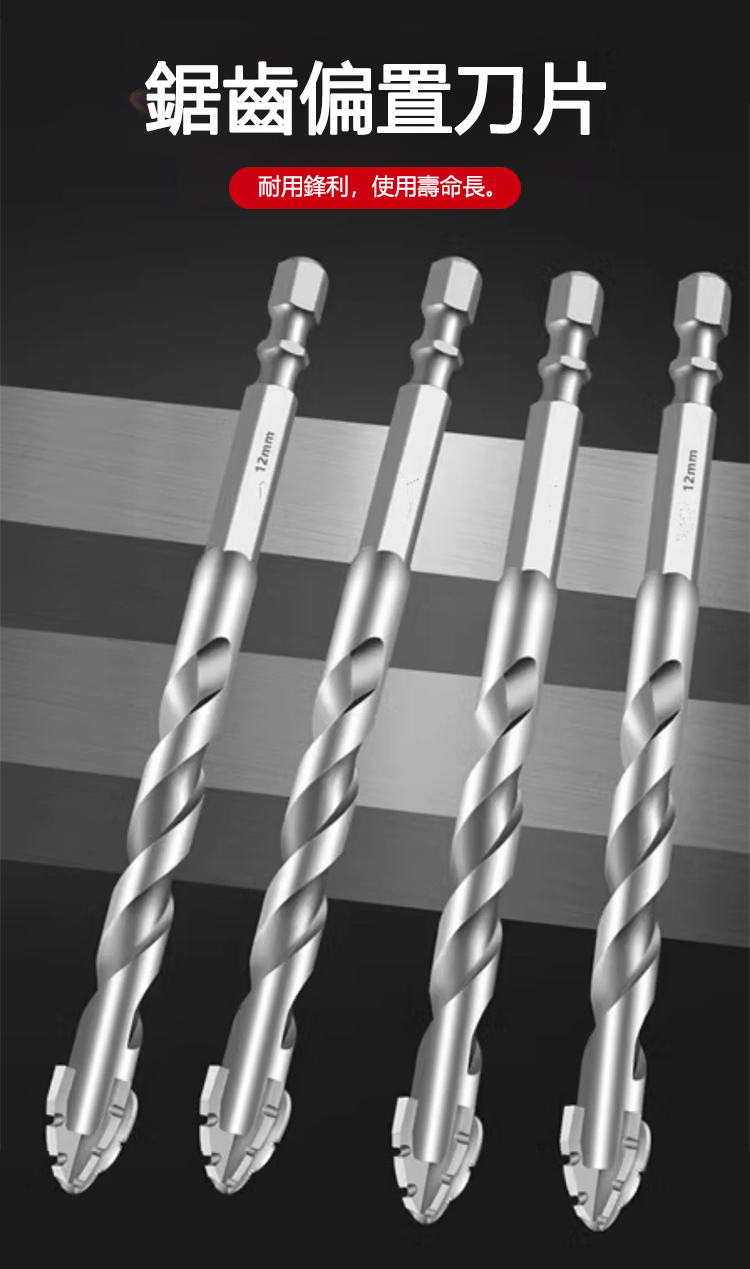 採用高強度合金材質,四刃偏壓鋸齒設計,刀刃鋒利耐磨,經過極限測試,連續鑽 300 個孔依舊保持鋒利。偏置鑽尖精準定位,不用反覆校準,一鑽到位,避免孔位跑偏;螺旋疏水槽設計,排屑順暢、散熱快,乾打也不怕鑽頭過熱損壞,延長使用壽命