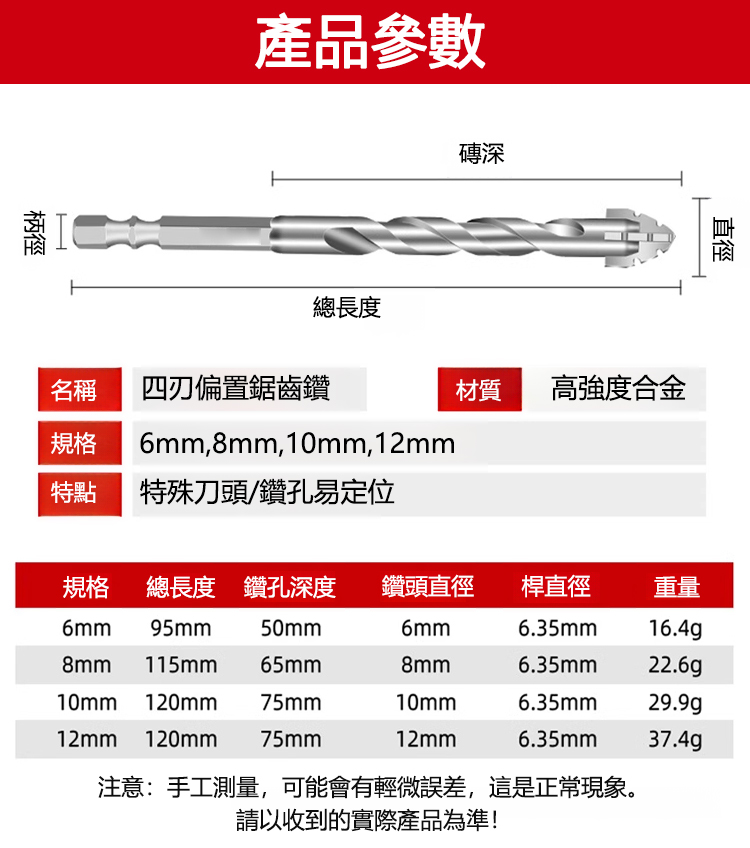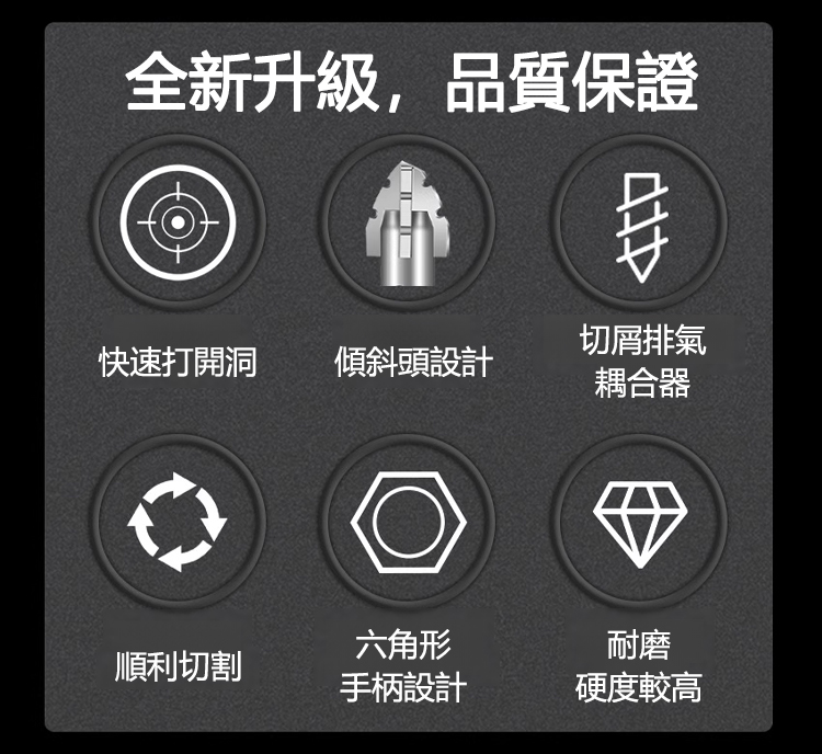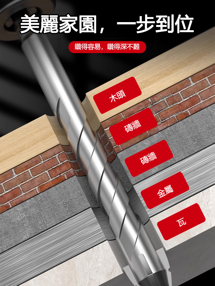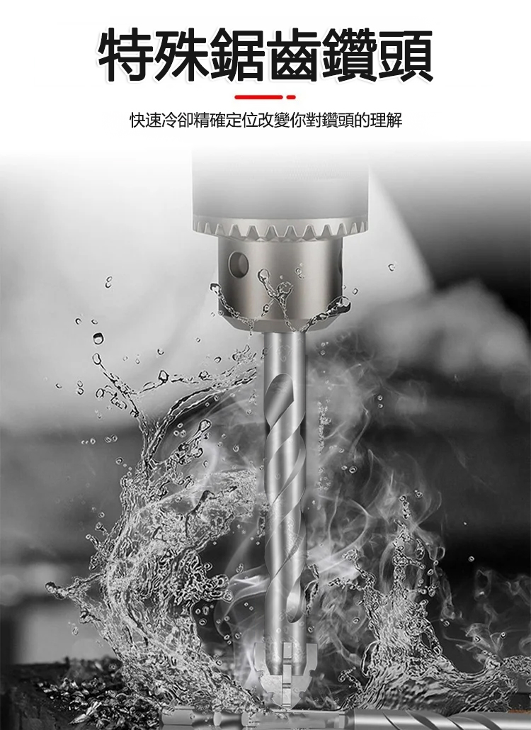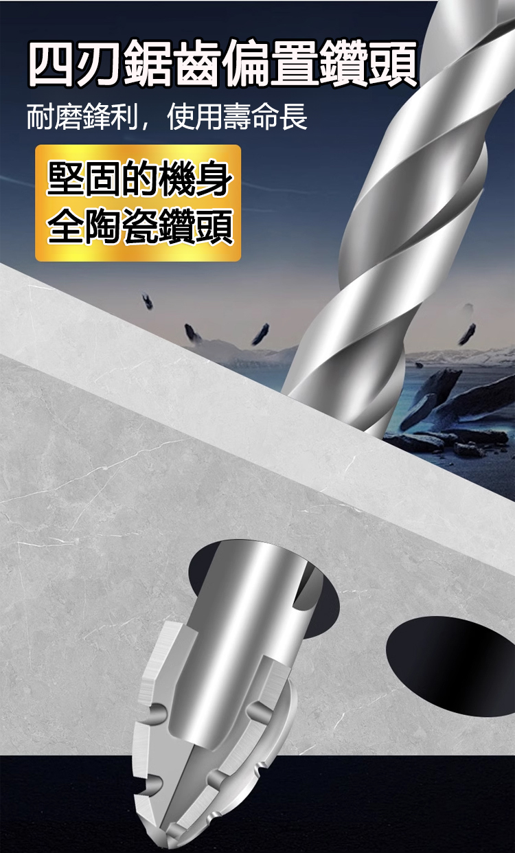 採用高強度合金材質,四刃偏壓鋸齒設計,刀刃鋒利耐磨,經過極限測試,連續鑽 300 個孔依舊保持鋒利。偏置鑽尖精準定位,不用反覆校準,一鑽到位,避免孔位跑偏;螺旋疏水槽設計,排屑順暢、散熱快,乾打也不怕鑽頭過熱損壞,延長使用壽命