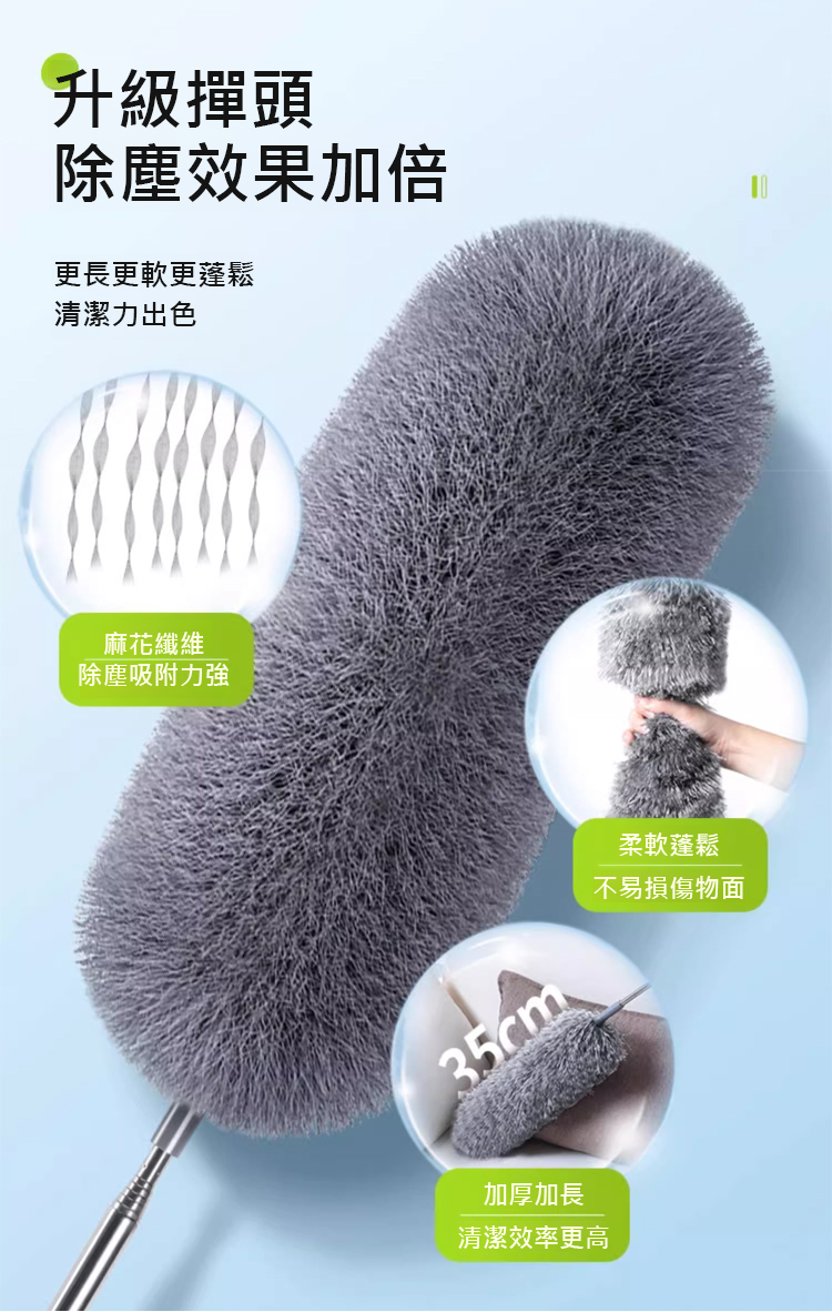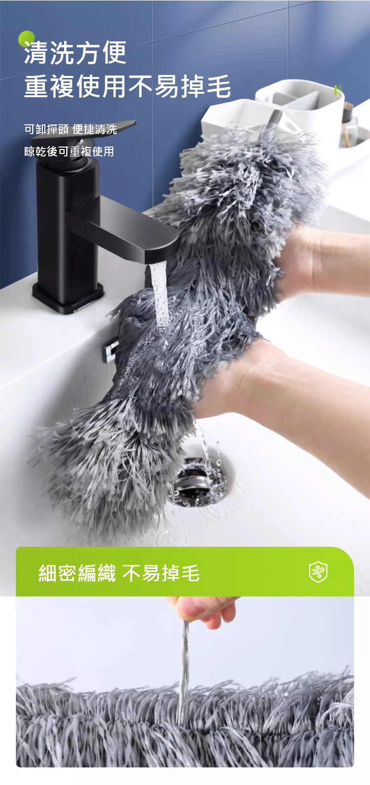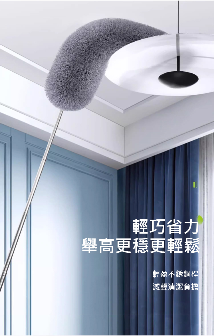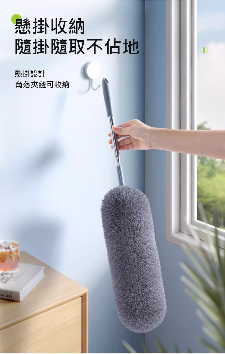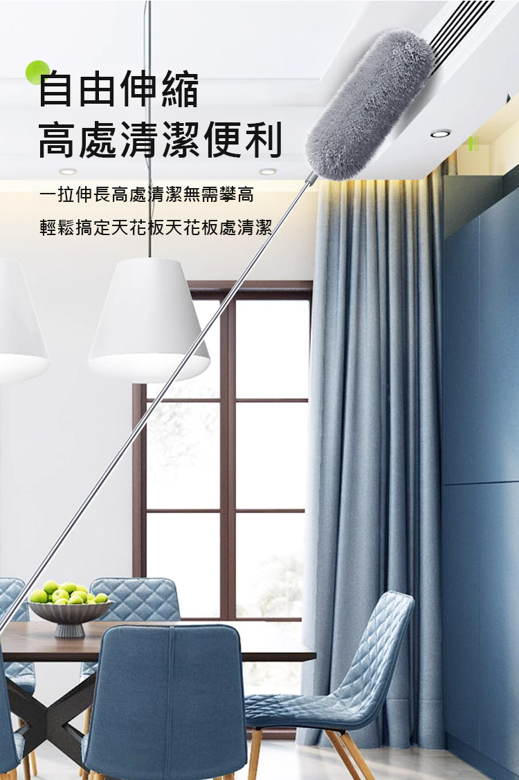 它能伸能縮,最短 30 厘米,最長能拉到 1.8 公尺!天花板的蜘蛛網、吊燈上的厚灰、衣櫃頂的積塵,不用爬梯子,站在地上隨手一夠就能擦乾淨,安全又省心!撣頭是超細纖維材質,靜電吸附灰塵不揚塵,擦完灰塵全粘在撣子上,不會揚得滿屋子都是,比雞毛撣子好用 10 倍!