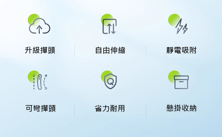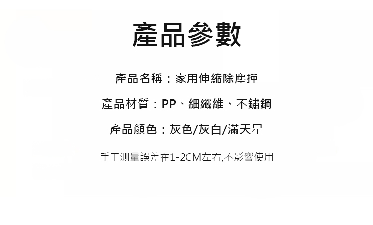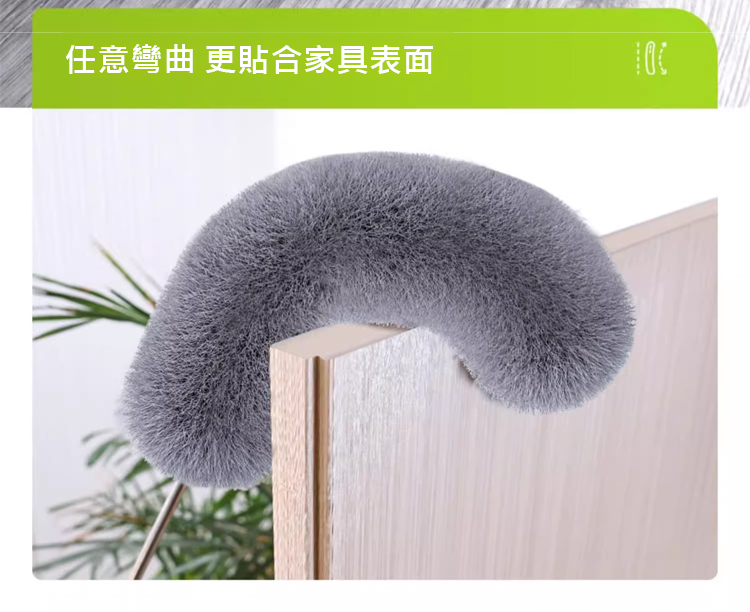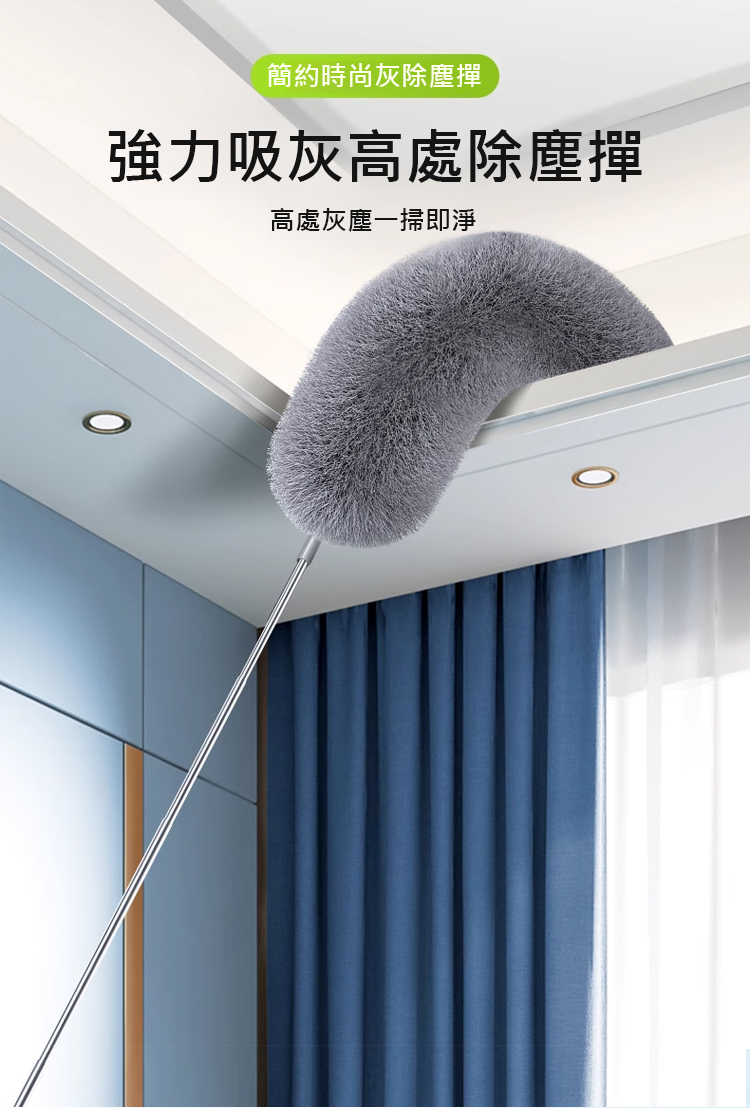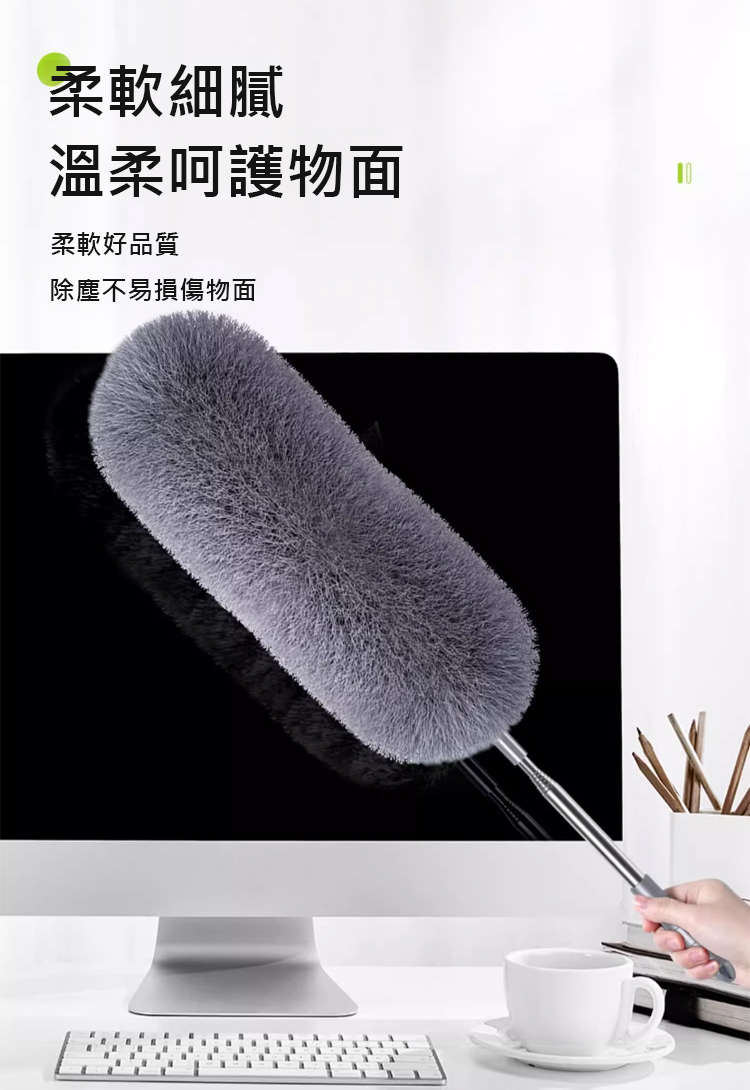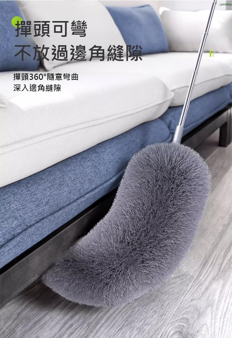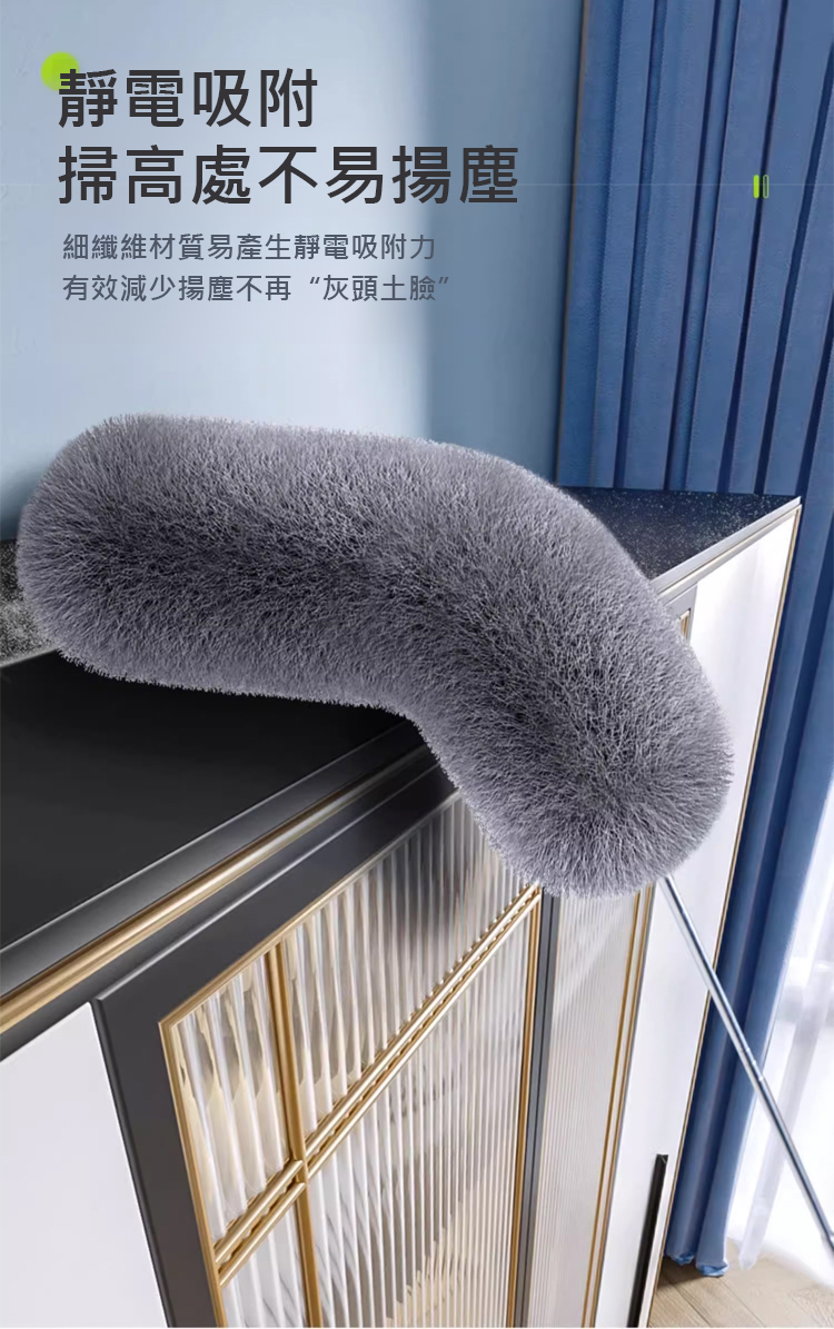 它能伸能縮,最短 30 厘米,最長能拉到 1.8 公尺!天花板的蜘蛛網、吊燈上的厚灰、衣櫃頂的積塵,不用爬梯子,站在地上隨手一夠就能擦乾淨,安全又省心!撣頭是超細纖維材質,靜電吸附灰塵不揚塵,擦完灰塵全粘在撣子上,不會揚得滿屋子都是,比雞毛撣子好用 10 倍!