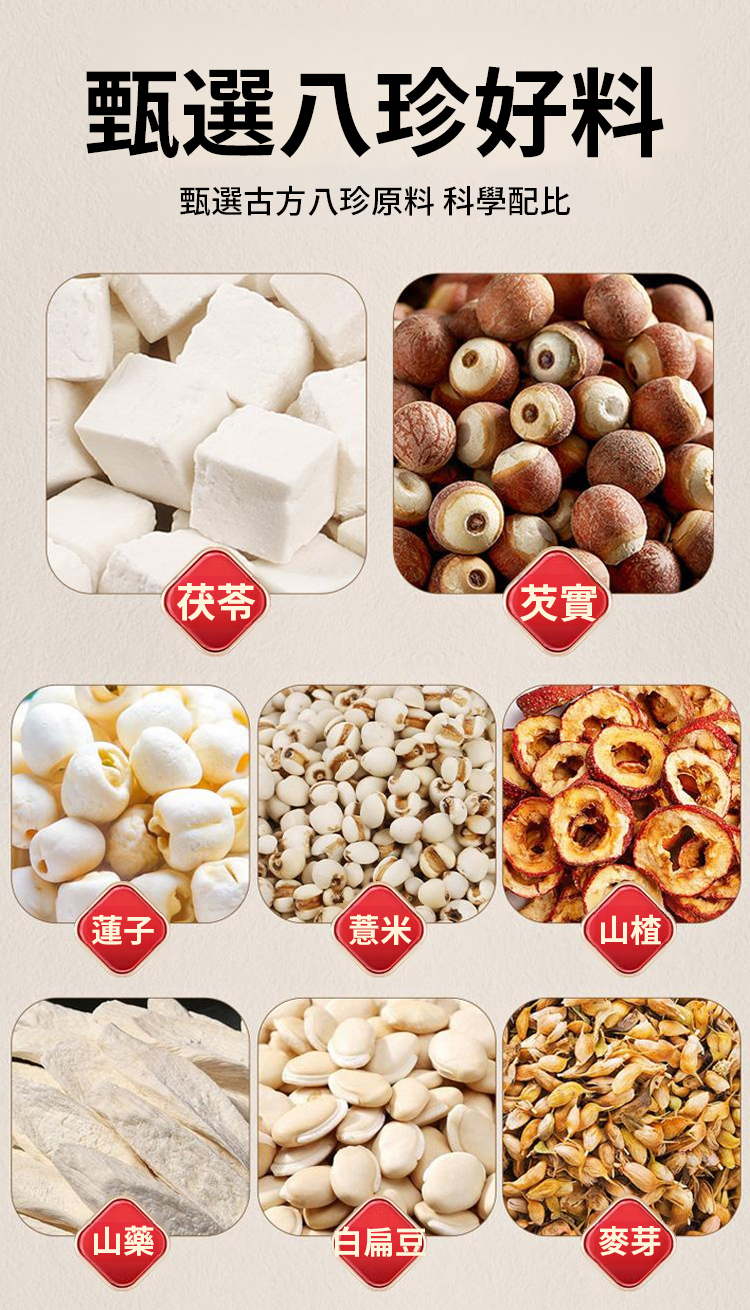 傳承清代宮廷御膳配方,精選白茯苓、山藥、芡實、薏米、蓮子等 8 味藥食同源食材,科學配比健脾益胃、利水祛濕。白茯苓被譽為 “四時神藥”,能調節胃腸蠕動;山藥、蓮子益氣養陰,改善脾胃虛弱引起的食慾不振,從根源調理亞健康。 0 蔗糖添加,以麥芽糖醇取代蔗糖,甜度溫和不齜膩,低 GI 值不升糖,控製糖黨、糖尿病患者也能安心享用。