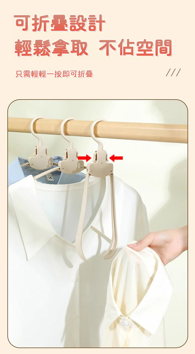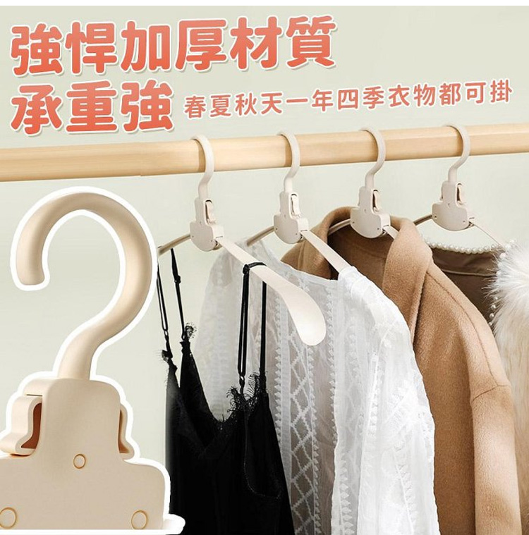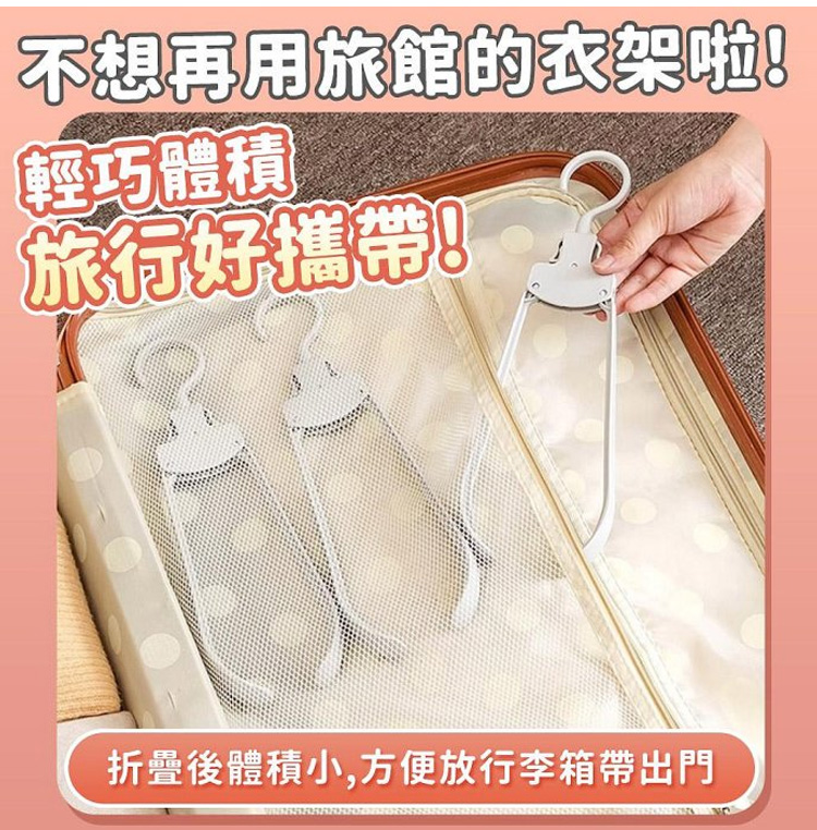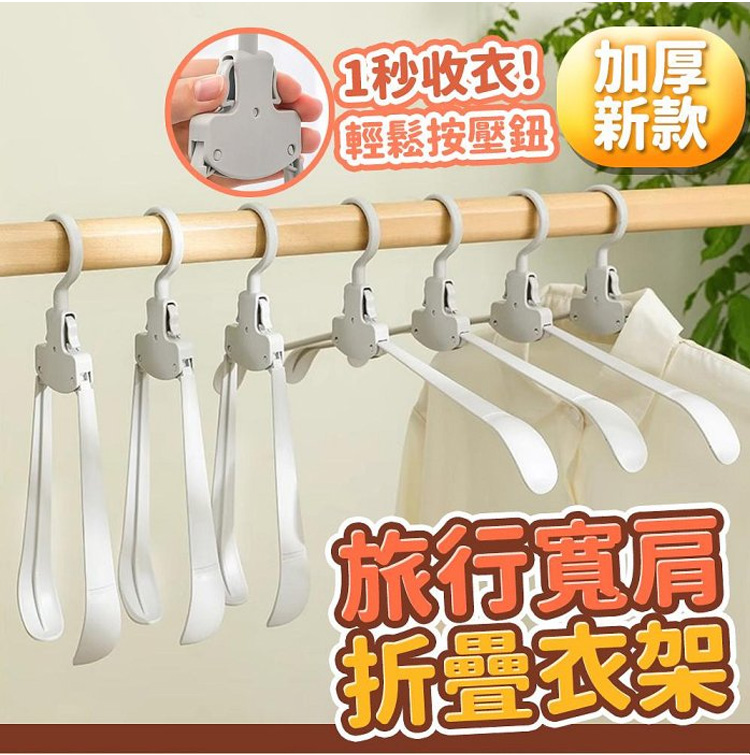 它的收納力和實用性雙在線!採用自動折疊設計,輕輕一按就能收攏,展開即用、折疊即存,10 個折疊後的體積僅相當於 1 個普通衣架,衣櫃、行李箱再也不用為衣架留空間,租房黨、小戶型超適配。加粗 ABS 材質 + 強化掛鉤,承重高達 5kg,厚外套、牛仔褲、羽絨外套都能輕鬆掛起,不易斷裂變形,重複使用耐用。