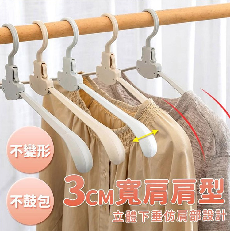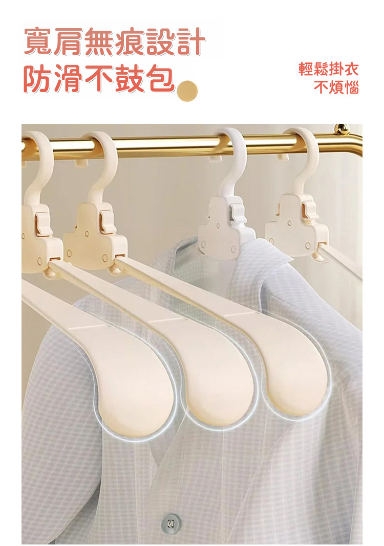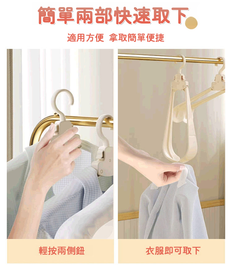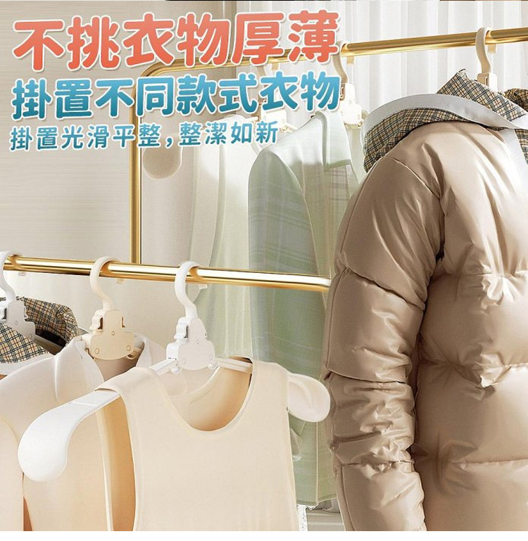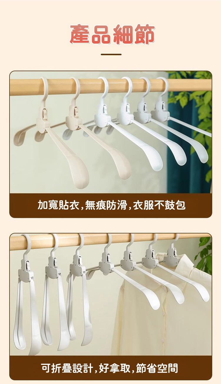 它的收納力和實用性雙在線!採用自動折疊設計,輕輕一按就能收攏,展開即用、折疊即存,10 個折疊後的體積僅相當於 1 個普通衣架,衣櫃、行李箱再也不用為衣架留空間,租房黨、小戶型超適配。加粗 ABS 材質 + 強化掛鉤,承重高達 5kg,厚外套、牛仔褲、羽絨外套都能輕鬆掛起,不易斷裂變形,重複使用耐用。